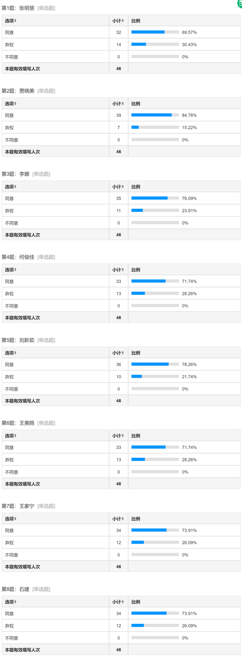 6.经会议表决决定,张明慧同志为宣传委员,石建同志为组织委员,王家宁同志为材料委员,贾晓美同志为纪律委员。