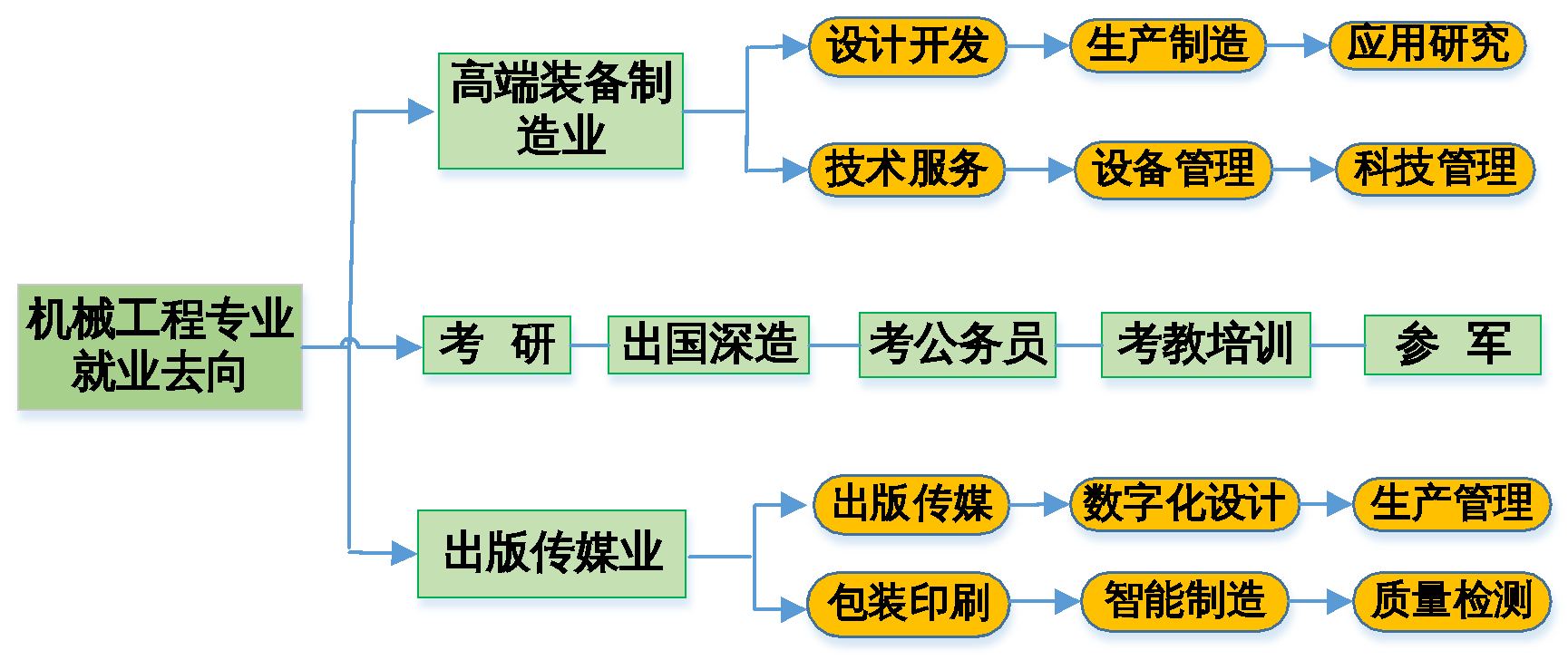 毕业后可在高端装备制造业从事设计开发、生产制造、应用研究、技术服务与设备管理等方面工作;在出版传媒业从事出版传媒、包装印刷、数字化设计、智能制造、质量检测、生产与技术管理、教育培训等相关工作;可攻读国内相关学科硕士研究生,也可通过本专业“中德卓越工程师计划”,申请赴德国70余所高校攻读硕士学位,或赴其他国家继续深造。2025年,本专业应届生考研上线人数占应届生总数的20%;近三年,年均升学出国深造比例17%。国内攻读硕士学校主要包括:北京航空航天大学、北京理工大学、中国农业大学、中国地质大学、北京工业大学等985/211学校。出国同学主要申请英国、澳大利亚、德国、美国等相关院校攻读硕士。本专业就业率一直在95%以上,毕业生及用人单位满意度较高。就业单位主要包括:浙江炜冈科技股份有限公司、中国兵器工业集团、厦门吉宏科技股份有限公司、中国建设银行、上海烟草集团等行业内外企业。
