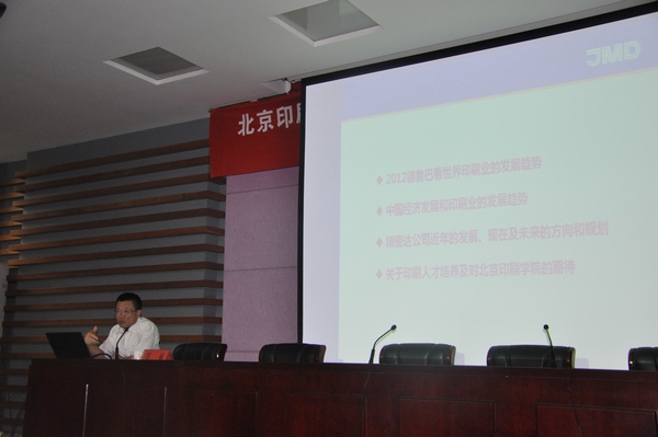 聘任仪式结束后,举行了“印刷产业技术发展及人才培养报告会”,报告会由信息与机电工程学院执行院长曹鹏主持。郑斌教授从以下四个方面进行了介绍:第一,从2012年德鲁巴印刷展透视全球印刷行业技术发展趋势;第二,我国印刷机制造行业应对国内外产业技术升级所带来的机遇与挑战;第三,精密达机械有限公司在印后成套装备制造方面的最新技术进展及未来发展目标定位;第四,对我国印刷行业人才培养模式方面的几点建议。